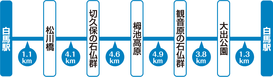 白馬駅をスタートし、松川沿いの道を緩やかに上る。目の前に広がる北アルプスの景色は大迫力だ。途中に切久保の石仏群や霧降宮切久保諏訪神社が現れ見どころも豊富だ。栂池パノラマ橋に向かって長い直線の坂道を下ると折り返し地点の栂池高原に到着。冬は雪に覆われるゲレンデが、夏には最新のアクティビティーで賑わっている。戻り道では観音原の石仏群や水車小屋などに寄り道しつつゴールの白馬駅へ。