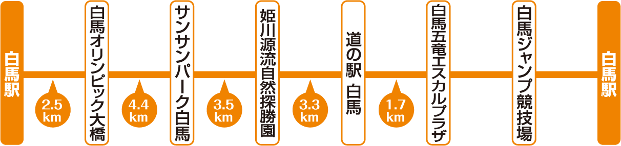 白馬の魅力をギュッと凝縮させた中級者向けのコース。キツイ上りもないので気軽に回ってみよう。白馬駅をスタートして、田んぼの中の一本道を走り姫川源流を目指す。途中の道には様々な石碑や石像などがあり、目を楽しませてくれる。姫川源流は周辺を散策できるようになっているので自転車を置いて散策してみるのも良いだろう。道の駅 白馬の先から裏道に入り、スキー場や田園風景の中を抜けて「白馬オリンピック大橋」を渡る。そのあとはのんびり白馬村の中心地を経由して白馬ジャンプ競技場に向かう。長野オリンピックの歴史がよく解るオリンピックギャラリーを見学したり、展望台に上り白馬の景色を楽しむ事ができる。最後は、松川沿いの道を気持ち良く下ればゴールの白馬駅に到着!