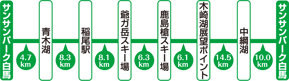 サンサンパーク白馬をスタートし、安曇野アートラインを緩やかに上る。青木湖・中綱湖の東側の湖畔沿いを走り木崎湖へ。県道325号で爺カ岳スキー場前を抜けて黒沢林道に入ると間もなく鹿島槍スキー場に到着!小熊黒沢林道に上る道では最も楽なルートである。あとは尾根伝いに走り木崎湖展望ポイントへ。木崎湖に下り、湖畔の静かな西側ルートを走りサンサンパーク白馬に戻る