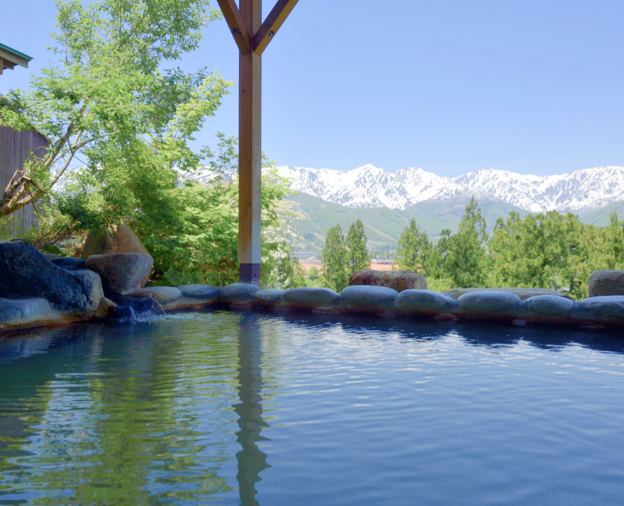 JR白馬駅から八方へ向かう途中にあり、露天風呂からは、八方尾根と白馬三山の眺めを楽しめます。桜の時期には夜桜を楽しみながら入浴できます。