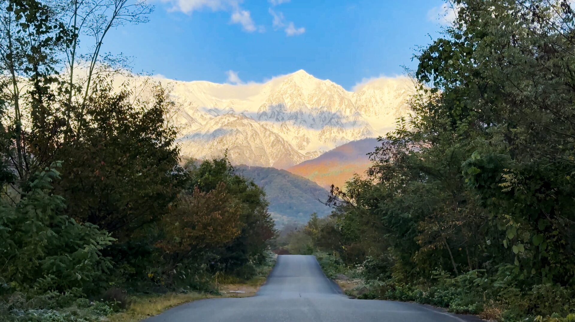 *「白馬三段紅葉」山頂付近の雪の白、中腹に残る紅葉、麓の緑の美しいグラデーション。ひとときの間しか見れない絶景です。