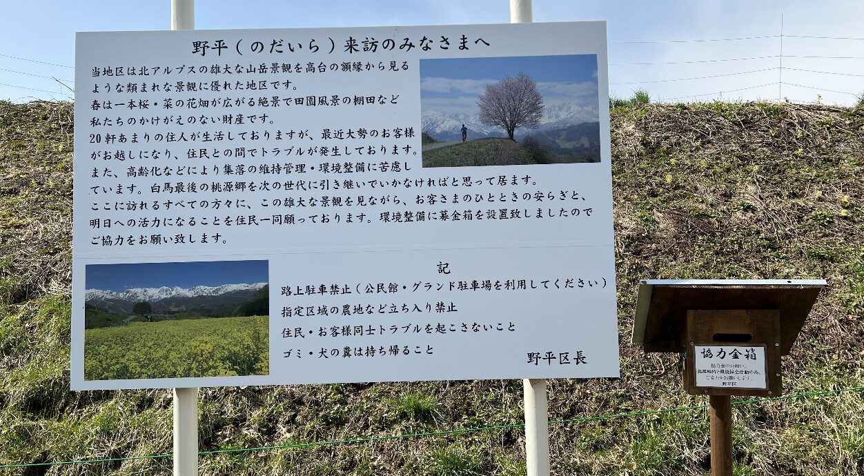 北アルプスを背景に美しい桜を楽しむことができます。壮大な風景をたくさんの皆さんに楽しんでいただけるよう、下記ご協力お願い致します。