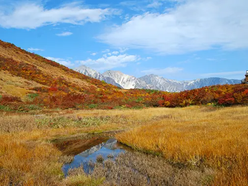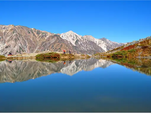 八方池周辺では例年9月下旬から錦色の紅葉を見る事ができます。 紅葉は標高が低い場所まで徐々に進み、山麓エリアまで約1か月間、木々が赤黄などに染まり、まるで絵画のような色鮮やかな美しい紅葉風景を見ることができます。 地元ガイドがゆっくりとしたペースで時間をかけて八方池まで歩きますので、トレッキング初心者の方も安心してご参加頂けるツアーとなってます。 ガイドの楽しい話を聞きながら、素晴らしい山々の景色を眺めながら白馬の秋を満喫しましょう。