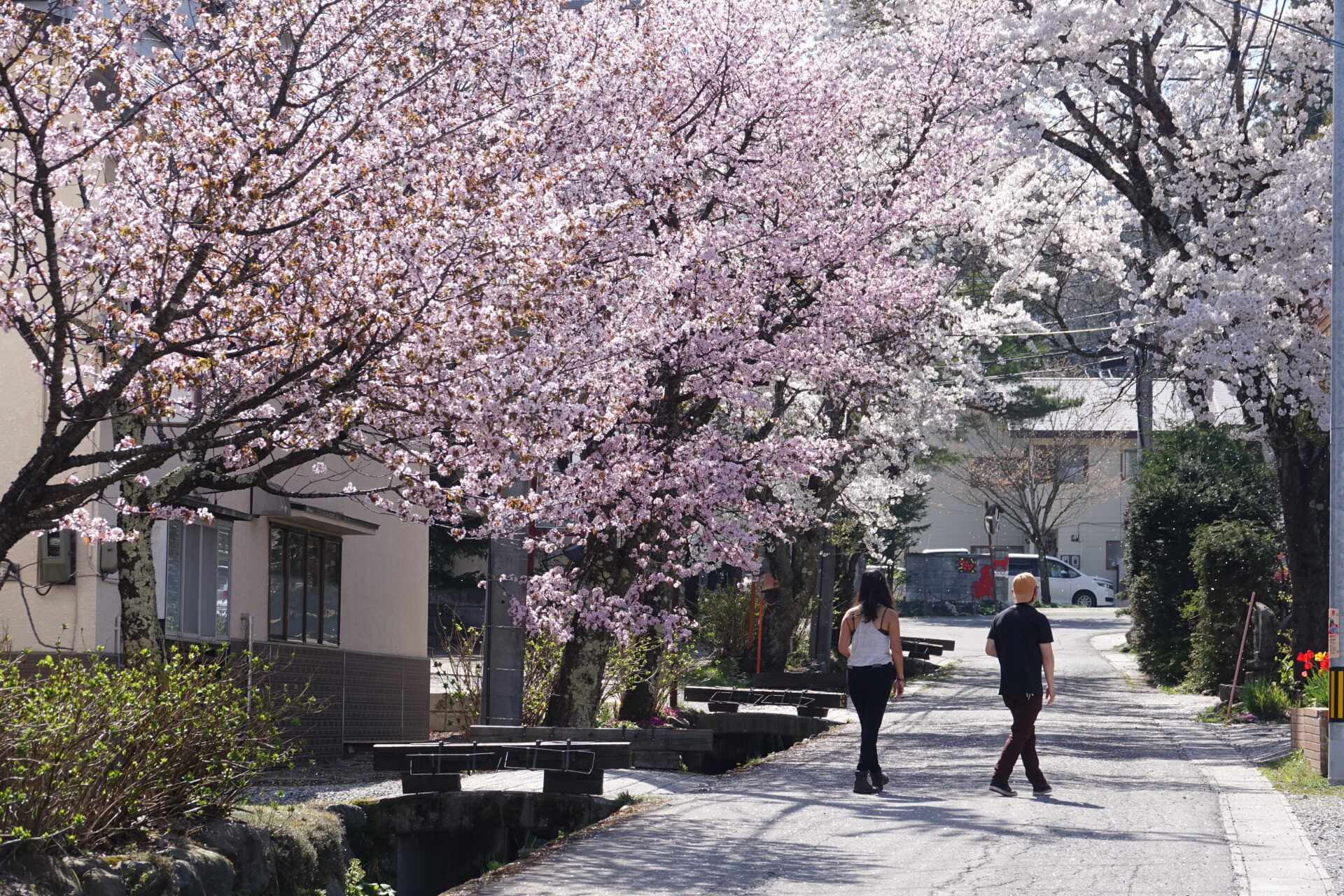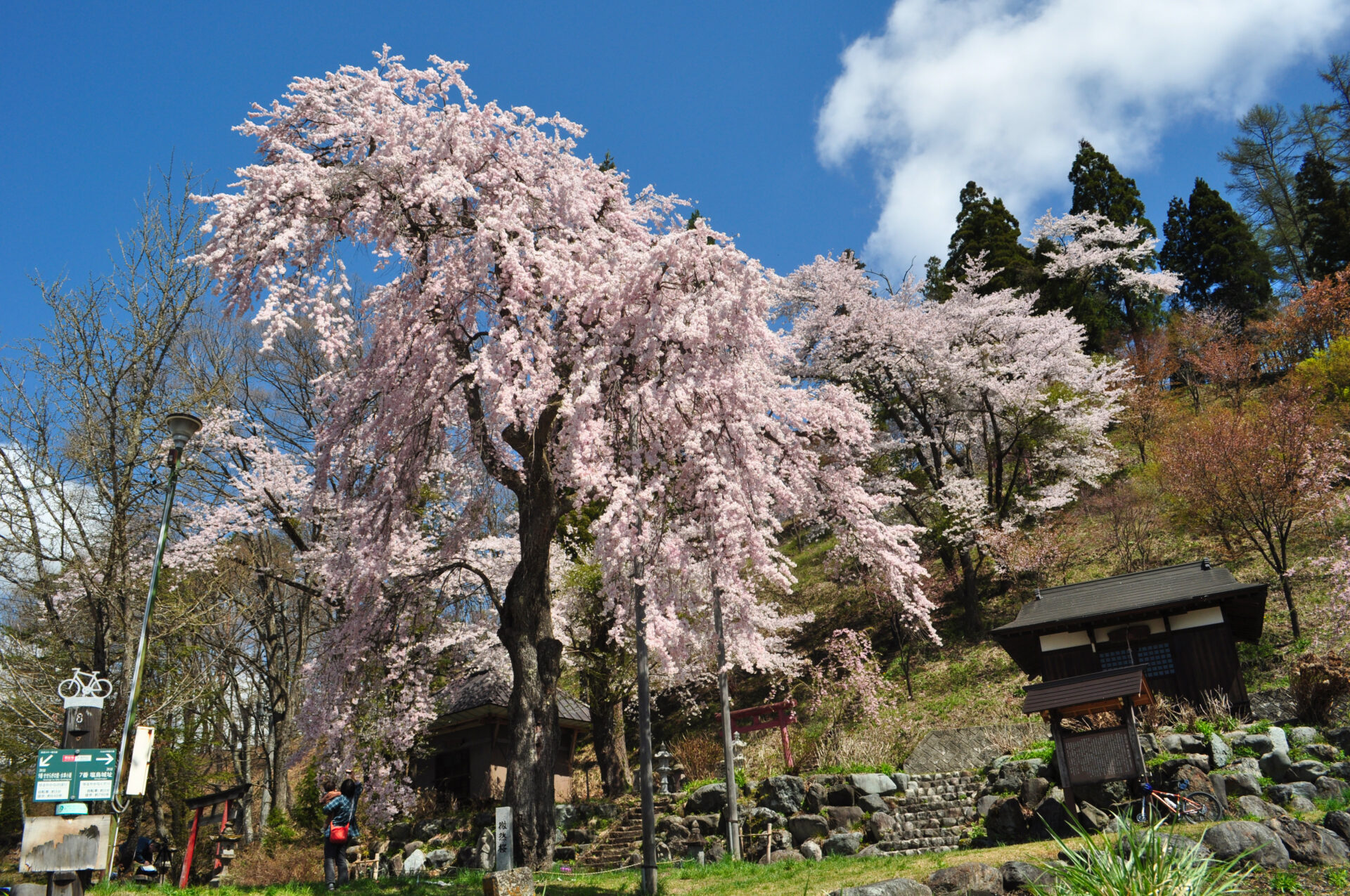 伝行山の麓に咲く枝垂れ桜は、植樹者の名前にちなみ、「徹然桜」とも呼ばれます。付近には神社のお社があり、満開の桜とのコラボレーションは多くの人を引き付けます。周辺には旅館街の桜並木もあります。