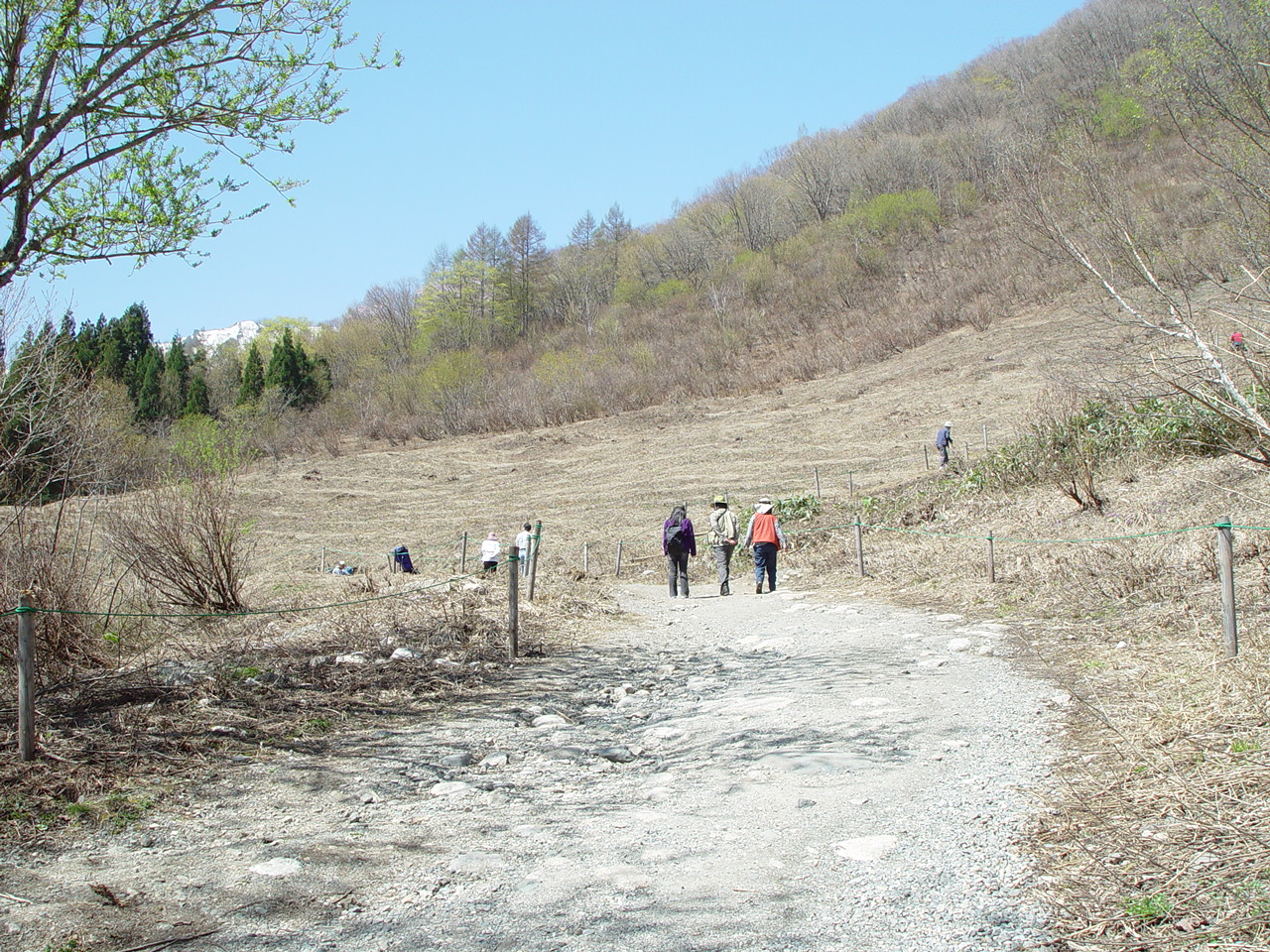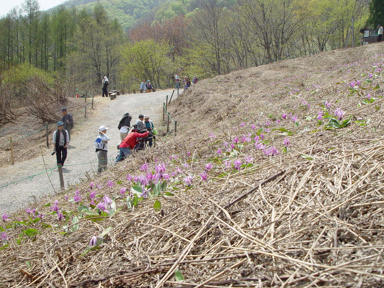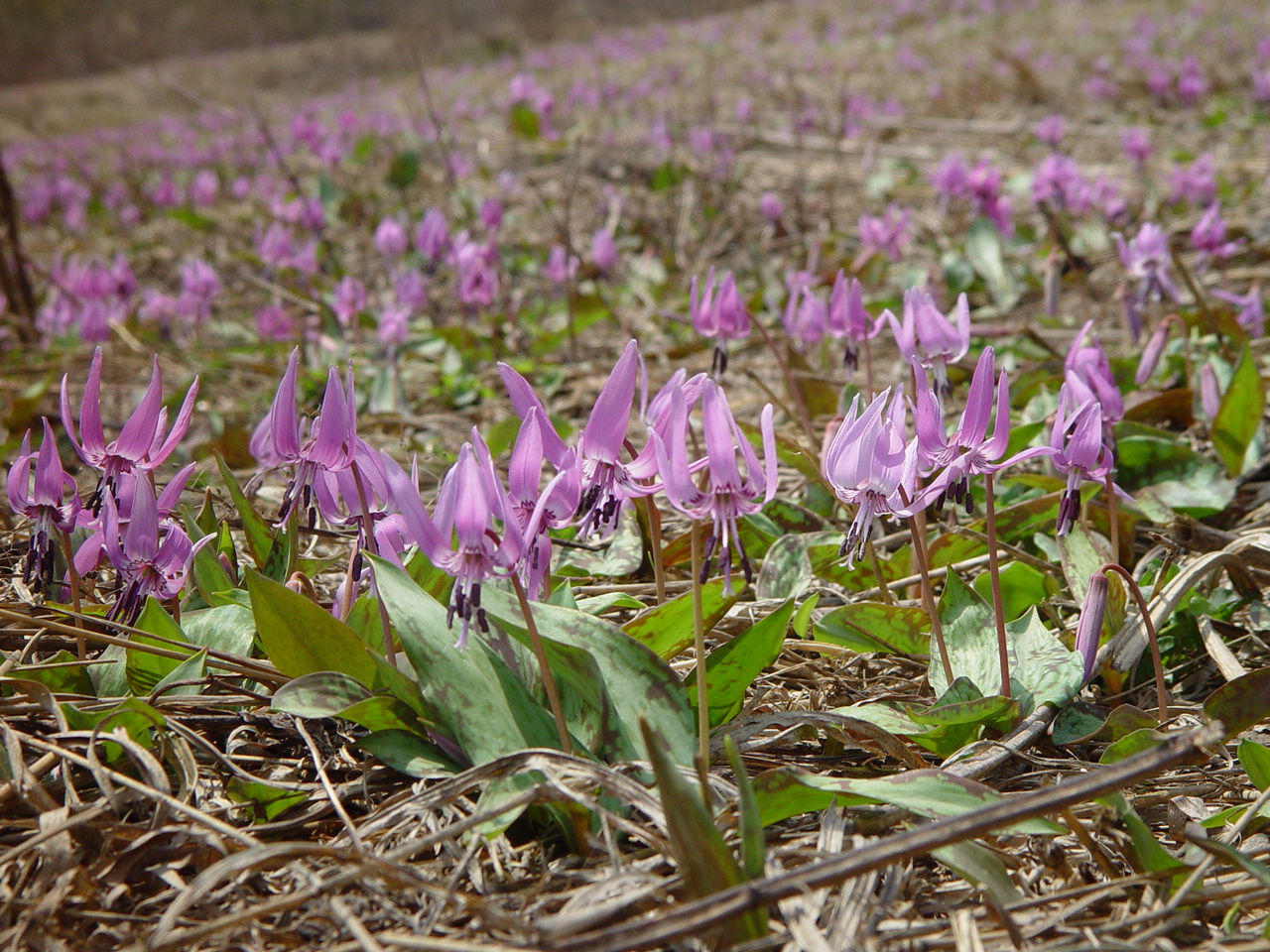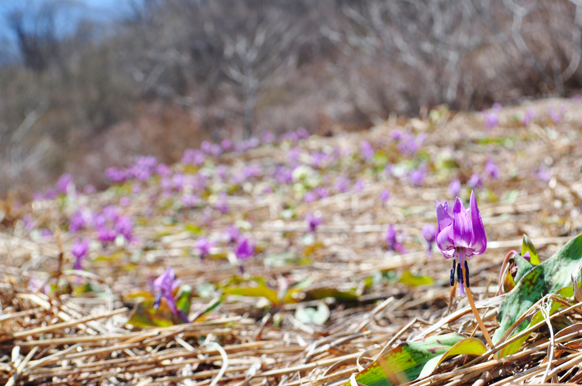 白馬五竜スキー場の麓に、白馬エリア最大級のカタクリ群生地があり、白馬村の村花でもある可憐なカタクリの花が咲き誇ります。花々の周りには、時折かわいらしい蝶も現れ、見る者目を和ませてくれます。