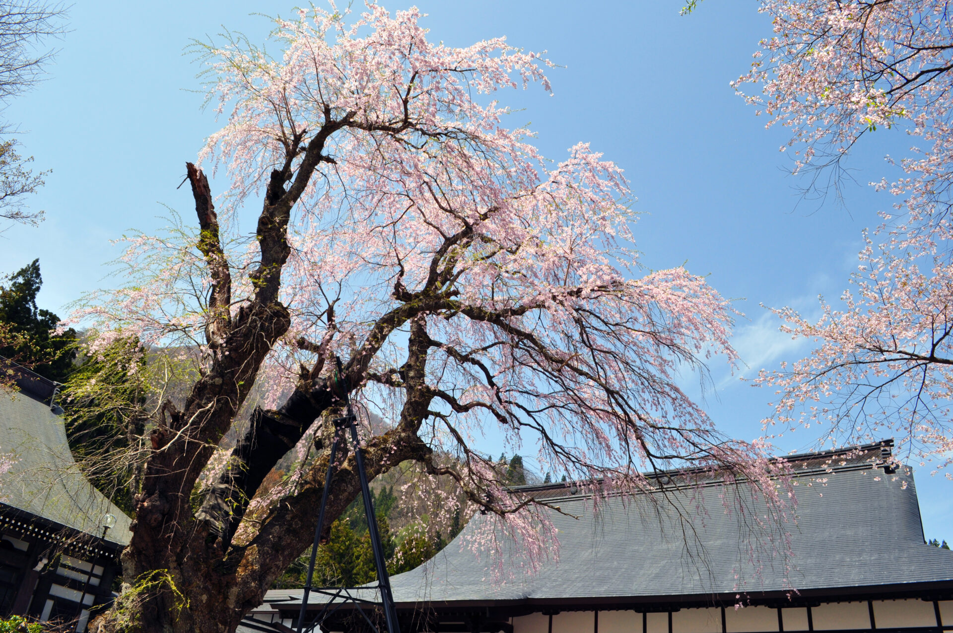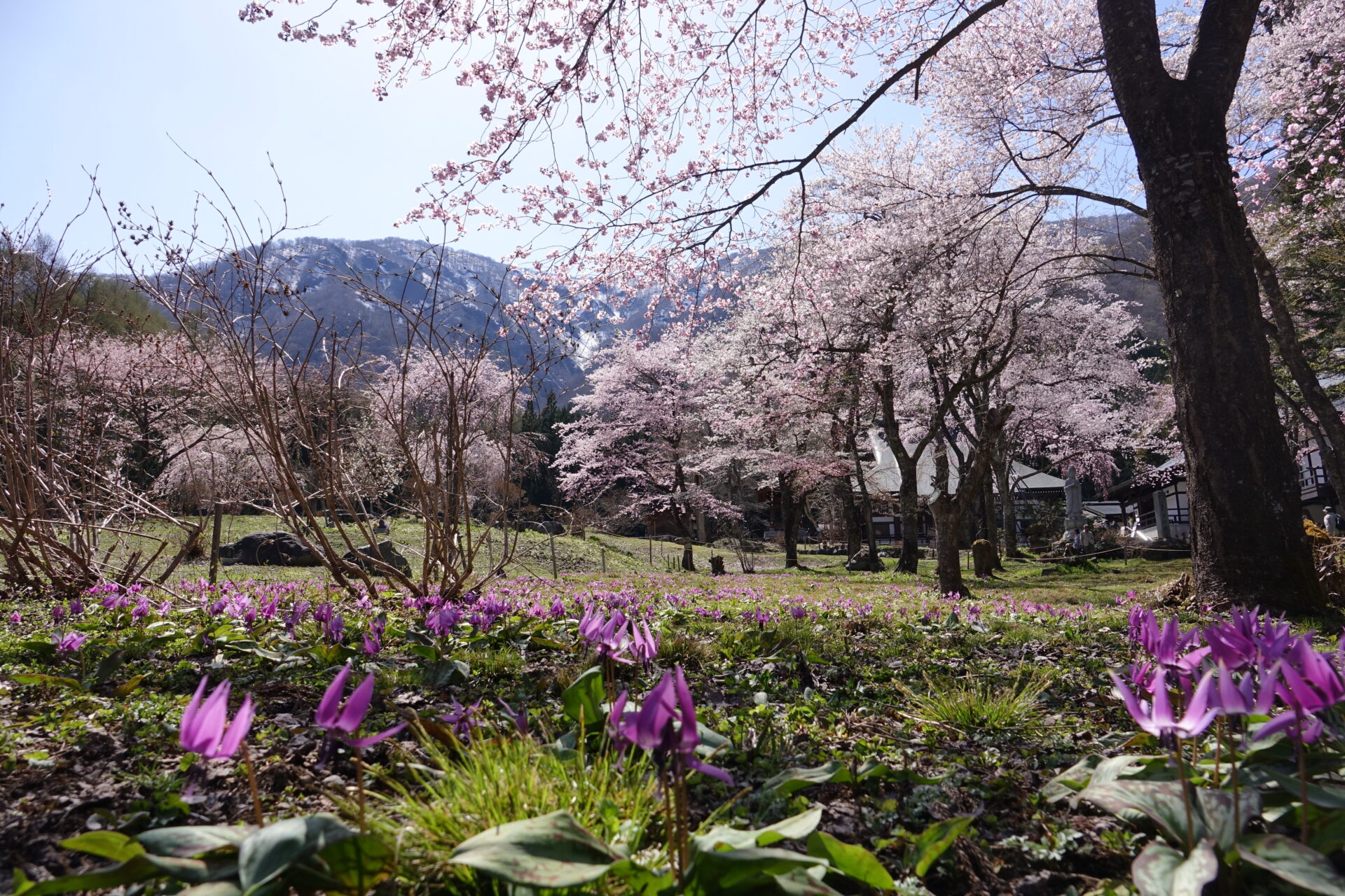 樹齢300年以上の古い枝垂れ桜が見事です。境内には他にも、オオヤマザクラやエドヒガンザクラなどの見ごたえのある桜が咲きます。また、境内脇の草地はカタクリの群生地としても有名です。